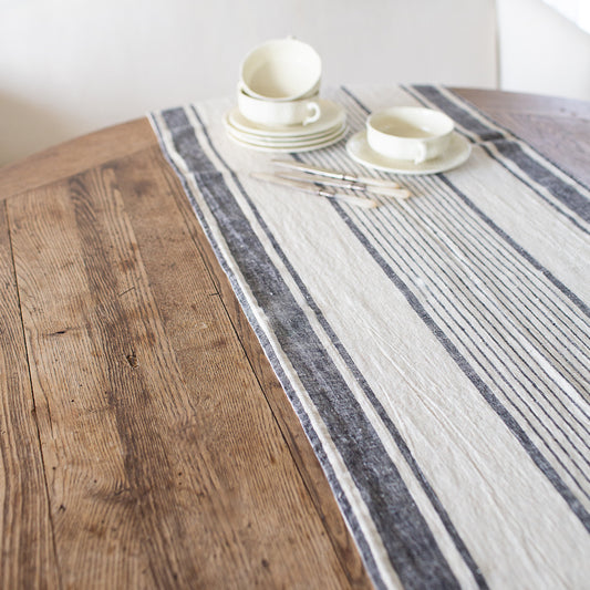 Linen Table Runner - Stonewashed - Antique White with Black Stripes - Luxury Thick Linen