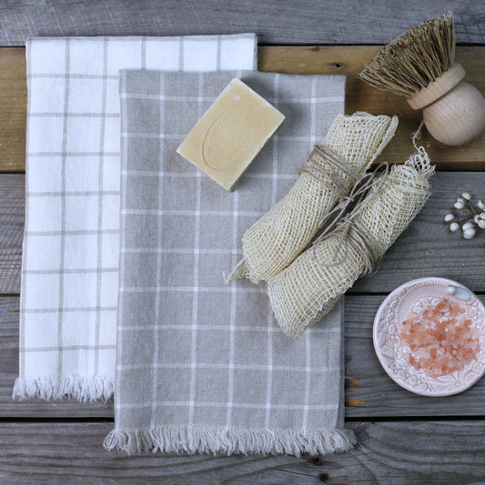 Linen Guest Towel - Stonewashed - Natural with White Squares and Frayed Edges - Luxury Thick Linen