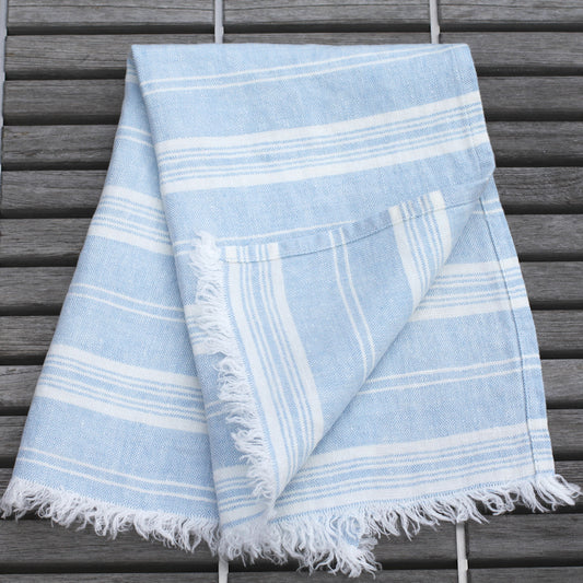 Linen Guest Towel - Stonewashed - Sky Blue with White Stripes and Frayed Edges - Luxury Thick Linen