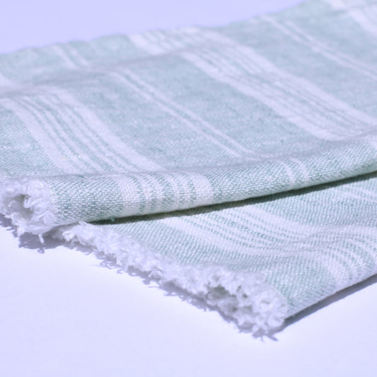 Linen Guest Towel - Stonewashed - Heather Light Green with White Stripes and Frayed Edges - Luxury Thick Linen