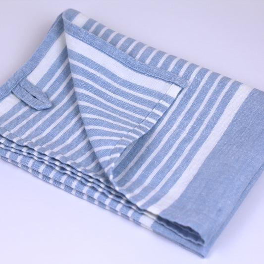 Linen Hand Towel - Stonewashed - Sky Blue with White Stripes 3 - Luxury Thick Linen