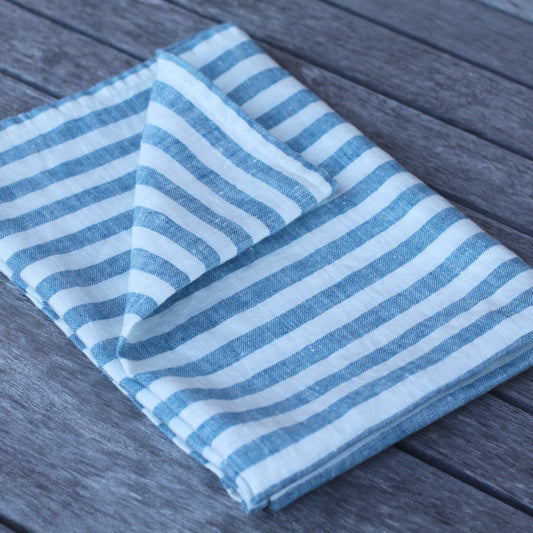 Linen Hand Towel - Stonewashed - Marine Blue White Medium Stripes - Thin Linen