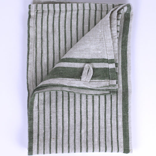 Linen Hand Towel - Stonewashed - Grey with Forest Green Stripes 2 - Luxury Thick Linen