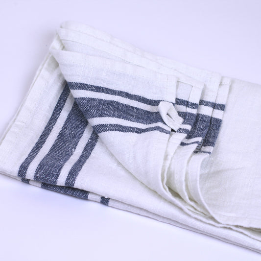 Linen Hand Towel - Stonewashed - White with Blue Stripes - Luxury Thick Linen