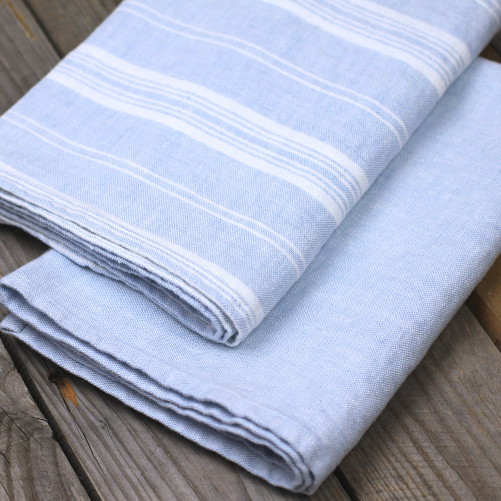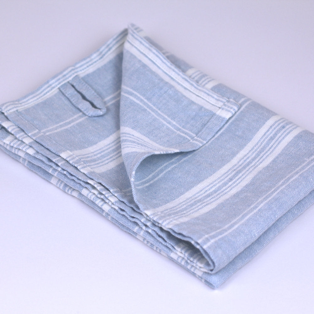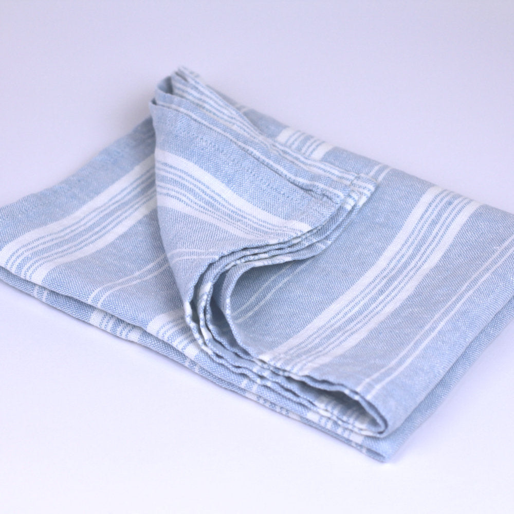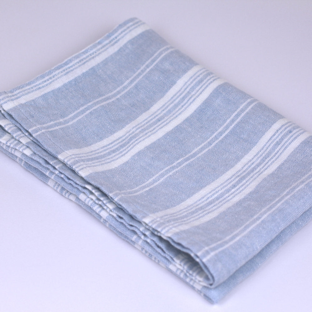 Linen Hand Towel - Stonewashed - Sky Blue with White Stripes 3 - Luxury Thick Linen